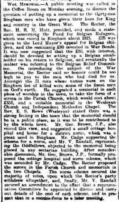 The provision of the memorial was a joint project of the Parochial Church Council and the Bingham Branch of the Royal British Legion, formed in 1921, and succeeded in no small part through to the stalwart efforts of one Ann Harrison (1829-1928).